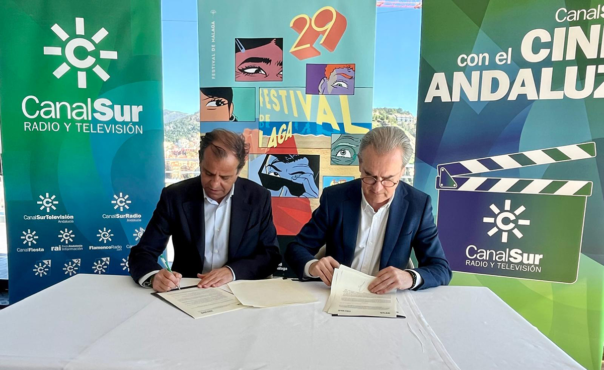 The Director General of Canal Sur, Juande Mellado, and the Director of the Festival de Málaga, Juan Antonio Vigar, signed a collaboration agreement this Monday for 29 Festival de Málaga